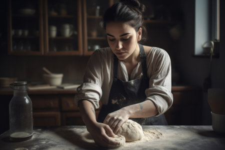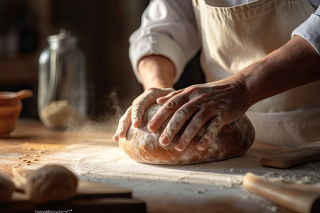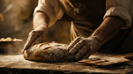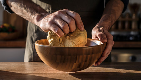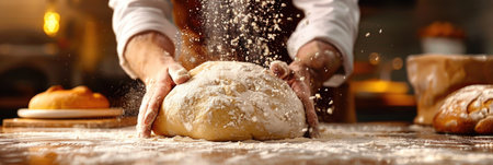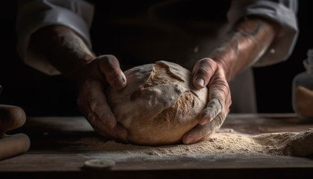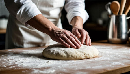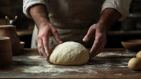 Baker preparing fresh bread in a rustic kitchen, captured in a moment of craftsmanship and tradition, with flour-dusted hands and wooden utensils.