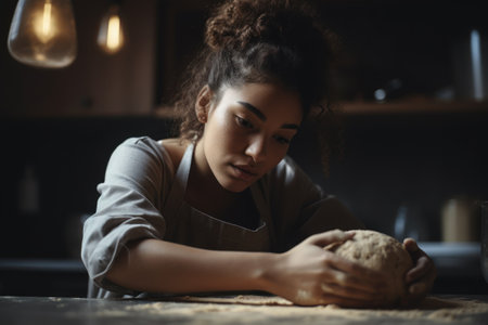 young african american woman in apron kneading dough in kitchen. Generative AI