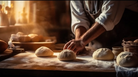 Artisan baker skillfully shaping a rustic loaf of bread in a warm kitchen filled with flour at sunrise. Generative AI