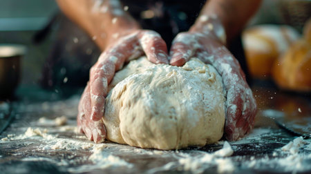 In the cozy bakery, a talented baker is skillfully kneading dough with flour-covered hands, creating a warm and inviting atmosphere filled with the aroma of freshly baked goods.