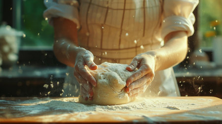 Baker's Hands Kneading Dough in a Sunlit Kitchen Close-Up. Concept Food Photography, Baking Inspiration, Kitchen Scenes, Art of Breadmaking, Handcrafted Breads