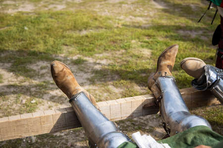 knight feet in steel boots medieval warrior equipment for fight and war