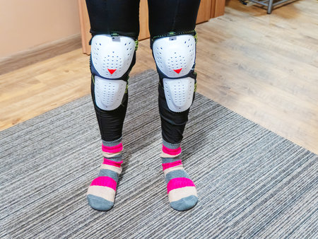 Womens legs in white plastic knee pads and striped socks
