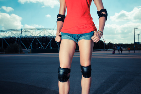 Woman rollerskater putting on knee protector pads on her leg