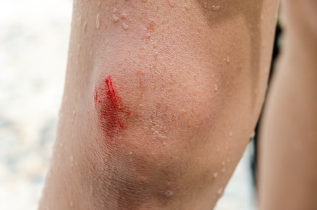 sore on the knee bruised wound on the knee, the boy fell and scratched his knee