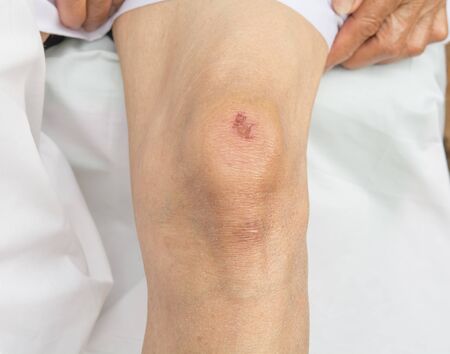 Woman suffering from bleeding wound on her knee,Scab becomes Infected