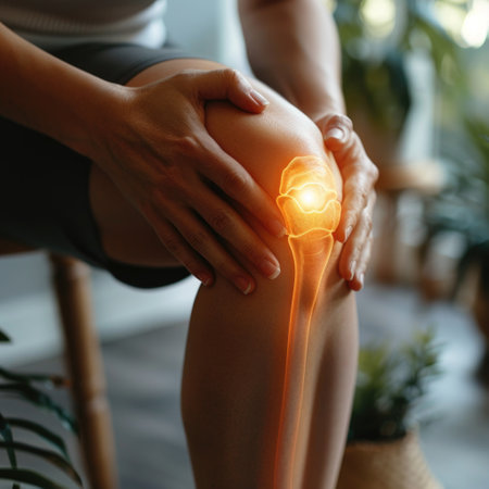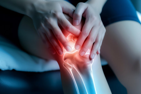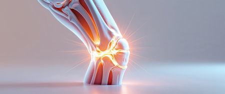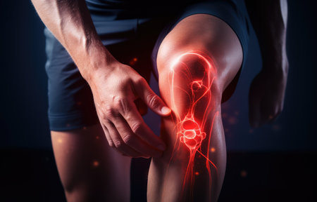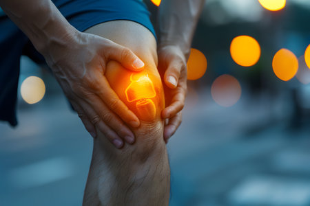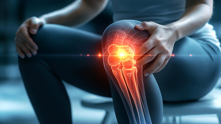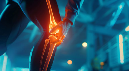 Person holding a knee with a digital glow effect illustrating pain or injury, joint and ligament issues. ideal for medical, healthcare, sports injury prevention, rehabilitation, and physiotherapy themes.