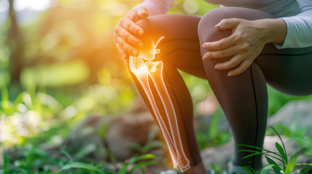 A woman holds her knee in pain, with a glowing red X-ray image showing the bones and ligaments.