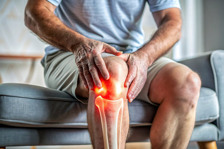 A man sitting in a chair touches his knee, suffers from repeated painful sensations about knee pain associated with the proximal aging process, tendonitis and arthritis, degenerative joint concept.