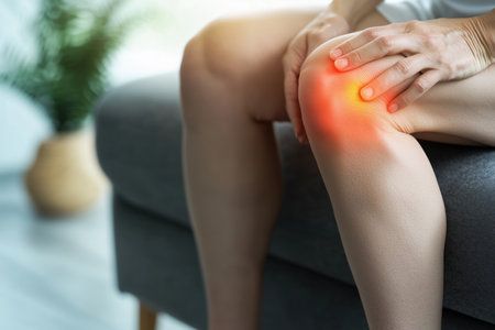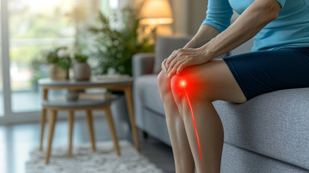 Woman Sitting on Couch Experiencing Severe Knee Pain, Highlighted in Red, Health Concept.