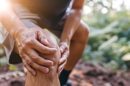 A woman experiencing knee pain while sitting in a lush green setting outdoors