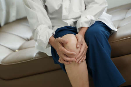 Asian middle-aged lady woman patient touch and feel pain her knee : healthy medical concept.