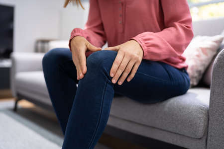 Young woman suffering from knee pain while sitting on sofa at home. Healthcare medical or daily life concept.
