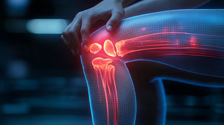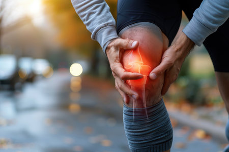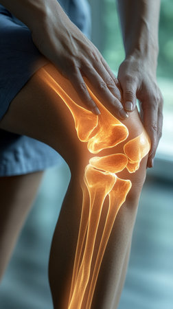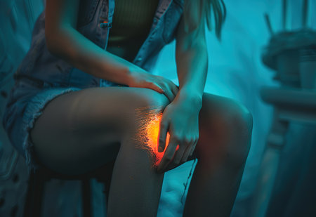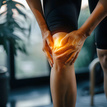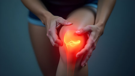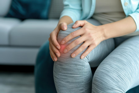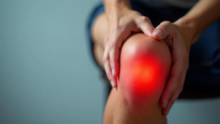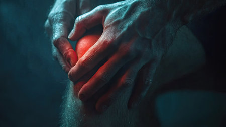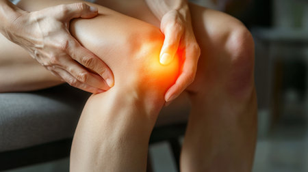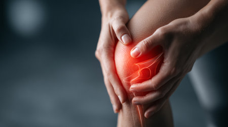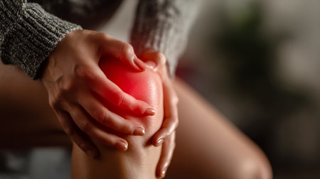 A hand gently presses a tender knee marked by redness and swelling, conveying discomfort and the need for soothing relief in a detailed close-up.