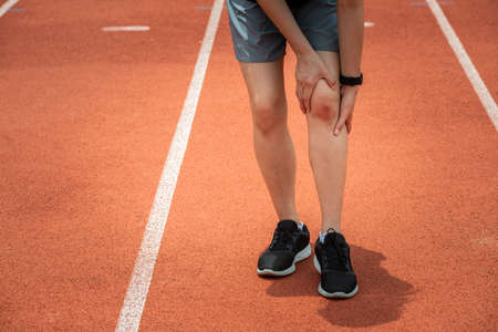 Shot of sport woman holding her knee, suffering from injury, she had bruise on her knee. Injured after runner falling or impact running track floor.