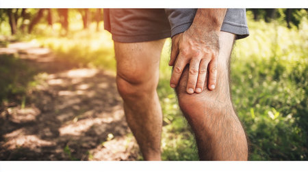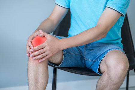 Close-up of a man in casual wear clutching his knee in pain, possibly indicating a sports injury or joint issue.