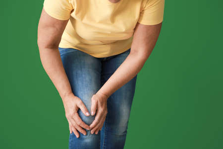 Mature woman suffering from pain in knee on color background