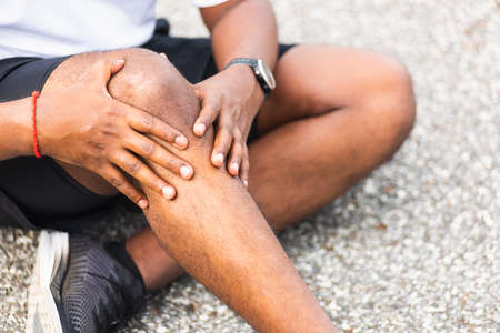 Close up Asian sport runner black man wear watch sitting he uses hands joint hold on his knee while running at the outdoor street health park, healthy exercise Injury from workout concept