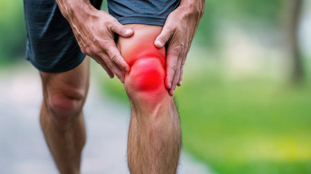 Man holding painful inflamed knee joint. Generative AI