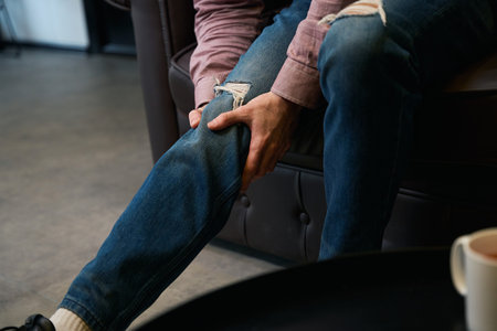 A man sitting on a sofa is grimacing while holding his knee with both hands, indicating discomfort. The scene captures a moment of struggle with a common injury. High quality photo