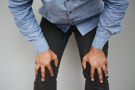 A Man is Holding His Knees While Experiencing Pain or Discomfort