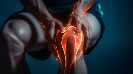 Close-up of a hand pressing tightly against a swollen knee, showing the sharp pain and discomfort in the joint.