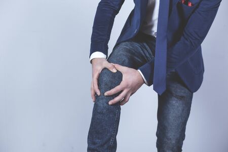 business man hand in ache knee on grey background