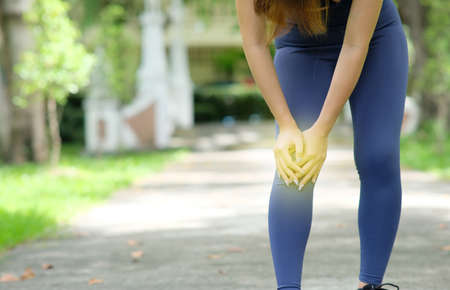 Close up Athlete running woman use hands hold on his knee while running in the morning.Knee injury on woman after traning for warm up her muscle.