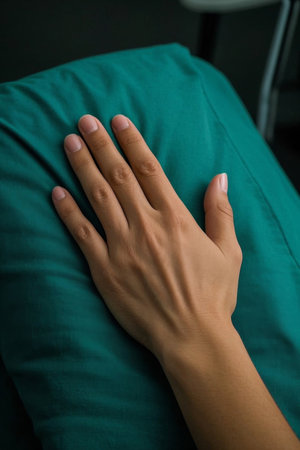 A gentle hand rests on a soft pillow, highlighting the cozy and warm atmosphere of a serene bedding setup. This image evokes feelings of comfort and relaxation.