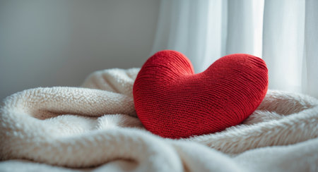 AI Generated. red knitted heart shaped pillow on bed with white blanket close up