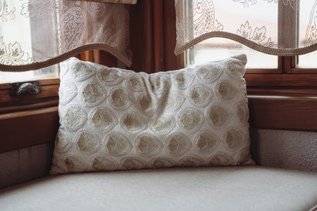 front view closeup of pillow with embroidery on divan in front of window