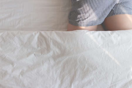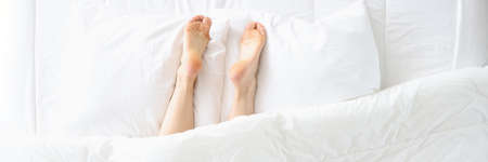 Body part of woman sleep on white bed in bright morning light.,