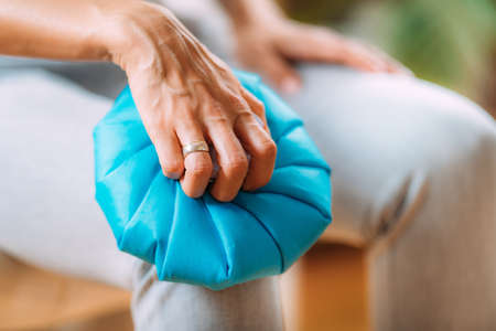 Knee pain treatment. Woman holding an ice bag pack on her painful knee