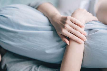 Close up of womans hands hugs a pillow