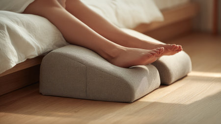 A cozy view of relaxed feet resting on a soft foot cushion in a serene bedroom setting with natural light, emphasizing comfort and tranquility.