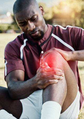 Injury, soccer player and athlete with pain on knee on a sports field, hurt and inflammation on his leg during a match. Black man, sportsman and person playing football with red overlay in fitness