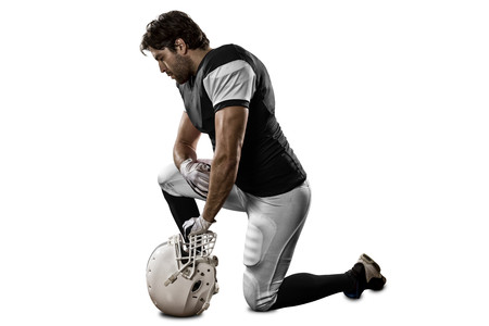 Portrait of boy, teenager, professional football player straighten clothesm, socks isolated over black background