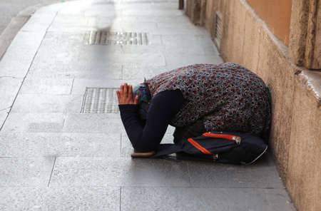 Elderly gypsy woman asking for alms kneeling on the ground with her hands clasped in supplication on the road