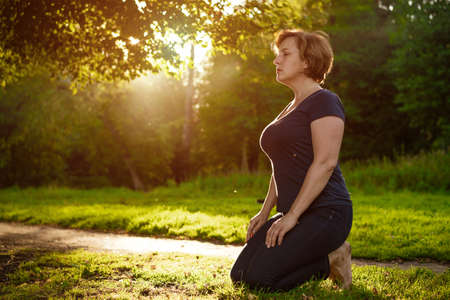 A silhouette of a young Christian woman is bowing her head in prayer, and desperation outside during sunset.