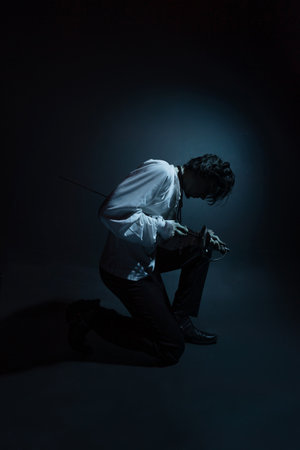 A dramatic hero with a sword in his hands, suffering from defeat and injury, a portrait in the moonlight, drama or theater