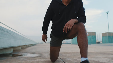 Young african man jogger exercising outdoors on a bridge, getting ready to start running