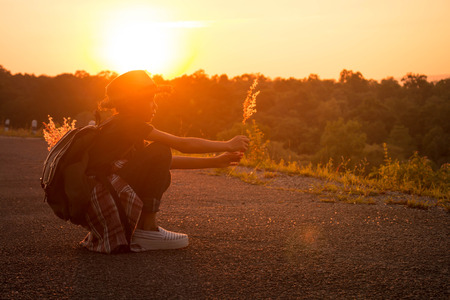 Silhouette girl backpack in nature, Concept silhouette mbackpack.