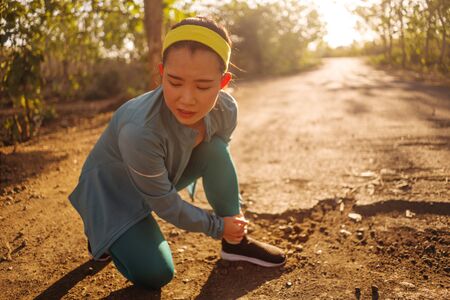 Asian jogger woman hurt while running. fitness lifestyle portrait of young attractive Chinese runner girl suffering sport injury during jogging workout on sunset road holding twisted ankle in pain