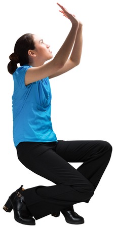 Attractive sexy brunette girl dancing booty dance in the studio sitting on blue background with copy space.