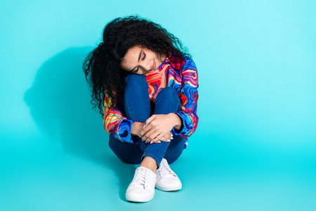 Full body portrait of nice young girl sit sleep floor empty space isolated on turquoise color background