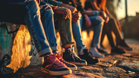 Legs of multiracial group of people chilling together, copy space