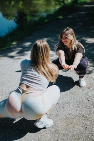 Two women performing squats outdoors, focusing on fitness and weight cutting exercises under natural sunlight