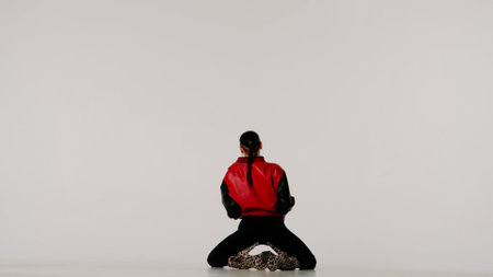 Attractive woman dancer wearing jacket and high heels sitting on the floor in the studio. Isolated on white background.