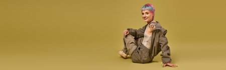 A young woman sits on the floor, showcasing her vibrant short hair and trendy outfit, banner