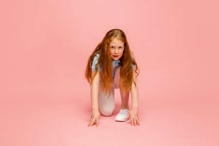 Low start, start up. Happy, smiley redhair girl isolated on pink studio background with copyspace for ad. Looks happy, cheerful. Childhood, education, human emotions, facial expression concept.